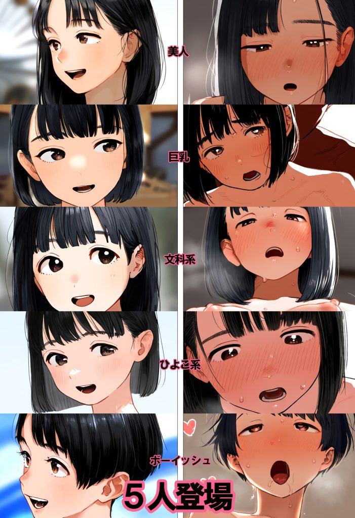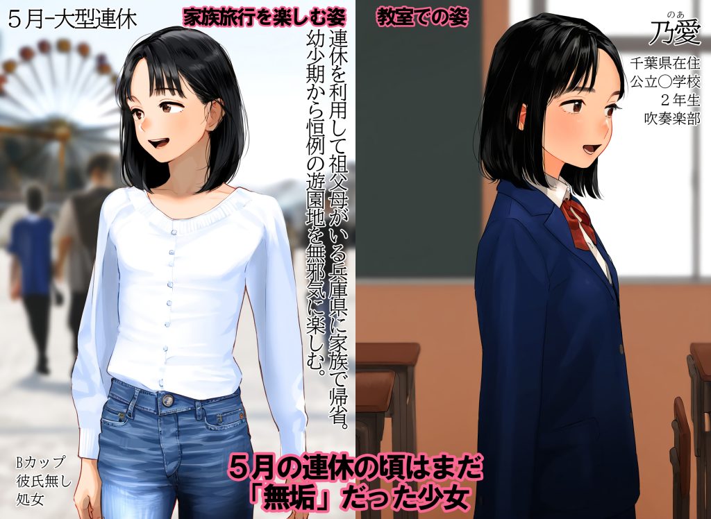 JC1~JC3まで、大型連休には処女だったが夏休み前後に処女喪失し経験人数1人となったセックス覚えたての少女が5人登場。ロリロリしているのに彼氏の上で夢中で腰を振る少女や、まだセックスに不慣れな少女、たっぷり中出しされて幸福感に浸る少女など幅広い少女が登場します。